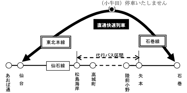 ・仙台・石巻間は直通運転のため、途中駅での乗降はできませんのでご注意ください。