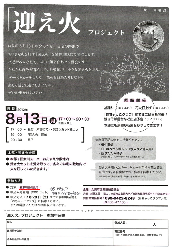 また、この「迎え火」は毎年開催する女川の年中行事とする予定です。「迎え火」で祖先をお迎えすると同時に、震災・津波の記憶を、毎年小さな灯火の元で、家族代々口述伝承して記憶に残す機会としたい。なぜ 2012 年にこの「迎え火」が女川